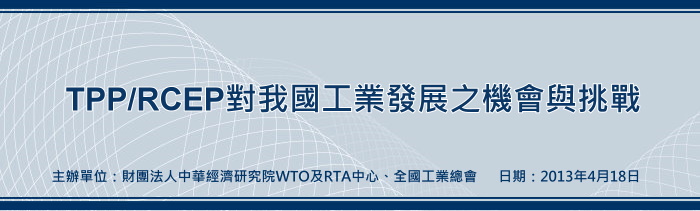 近年來,我國政府積極尋求加入跨太平洋夥伴協定(簡稱TPP),以提升我國的貿易競爭力,另一方面,東協(ASEAN)積極倡議成立「區域全面經濟夥伴關係」(簡稱RCEP);然而在TPP/RCEP的架構下,議題涵蓋範圍廣,自由化的程度更甚WTO,對於我國產業發展勢必帶來一定的影響。為促進我國各產業業者認識TPP/RCEP,並凝聚共識,中華經濟研究院(WTO及RTA中心)辦理「TPP/RCEP對我國產業之機會與挑戰」系列講座,以TPP/RCEP對我國各產業影響為主題,探討我國若加入TPP/RCEP後,對於工業將可能面臨之機會與挑戰,以增加各產業對TPP/RCEP之瞭解;期能藉由產官學三方的深入探討和互動,讓社會大眾認識TPP/RCEP的重要,激發更多實質的討論和共識。