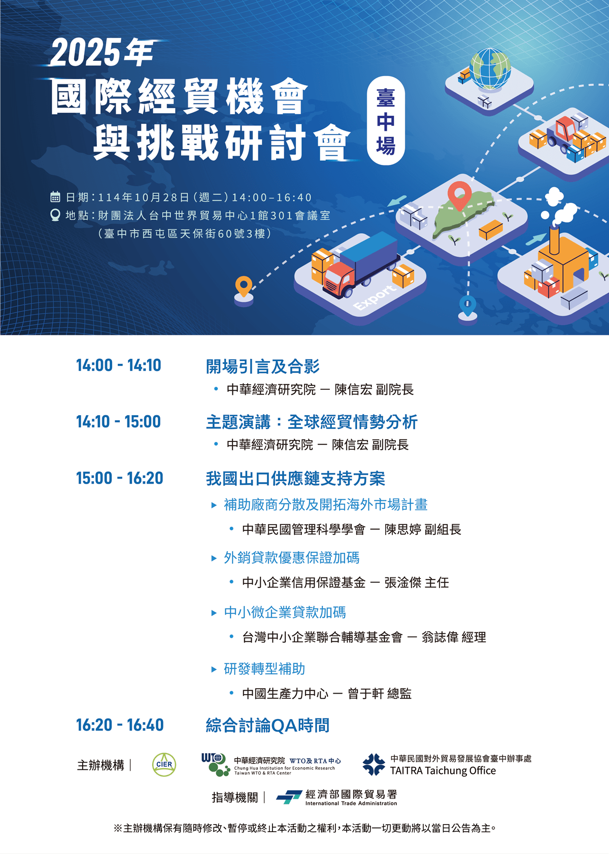 主辦機構:中華經濟研究院WTO及RTA中心、中華民國對外貿易發展協會臺中辦事處