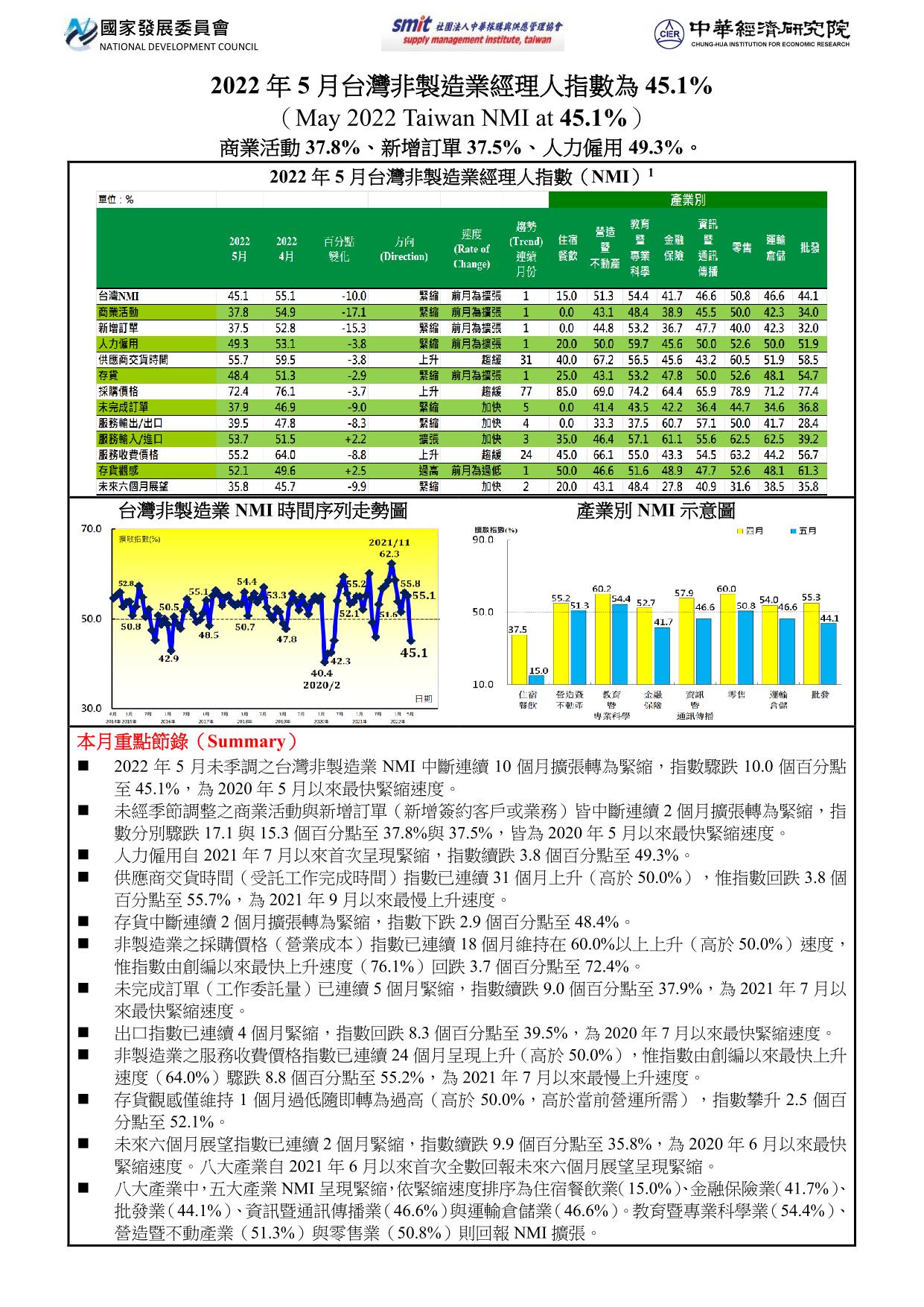 2022年5月未季調之台灣非製造業經理人指數(NMI)中斷連續10個月擴張轉為緊縮,指數驟跌10.0個百分點至45.1%,為2020年5月以來最快緊縮速度。