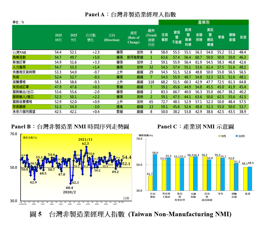2025年10月未經季節調整之台灣非製造業NMI已連續8個月擴張,指數續揚2.3個百分點至54.4%。