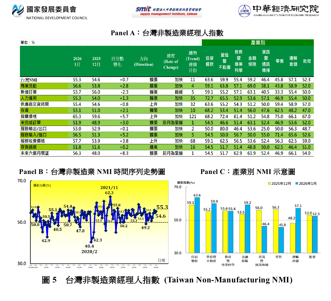 2026年1月未經季節調整之台灣非製造業NMI已連續11個月擴張,指數回升0.7個百分點至55.3%。