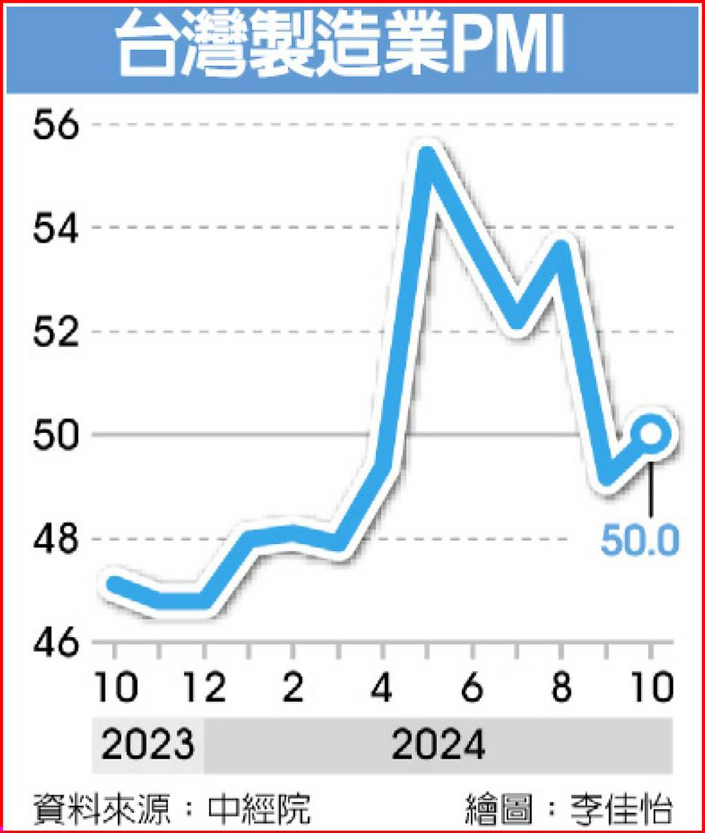 10月台灣製造業採購經理人指數PMI微幅回升0.8個百分點至50.0,快速扳回9月的緊縮(50以下)狀態,重現5月至8月連續4個月的擴張(50以上)趨勢。調研單位中華經濟研究院1日表示,製造業10月採購營運狀況與9月相比,大致呈現持平,PMI連月上上下下,景氣燈號也月月換燈,反映出景氣好轉並不扎實。